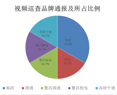 省、市邮政业安全中心通过“绿盾”工程视频巡查系统及中心监管平台对全市邮政企业、快递企业处理场所和营业网点进行在线巡查,对各类违规操作行为进行抓拍通报,本月共巡查点位113处,摄像头500个,累计发现6起疑似违规事件。