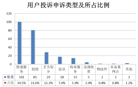 本月投诉、申诉较为集中的问题分别为投递服务(101件、39.5%)、损毁(81件、31.6%)、丢失短少(29件、11.3%)。
