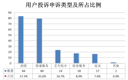 本月投诉、申诉较为集中的问题分别为损毁(84件、37.3%)、投递服务(80件、35.6%)、丢失短少(24件、10.7%)。