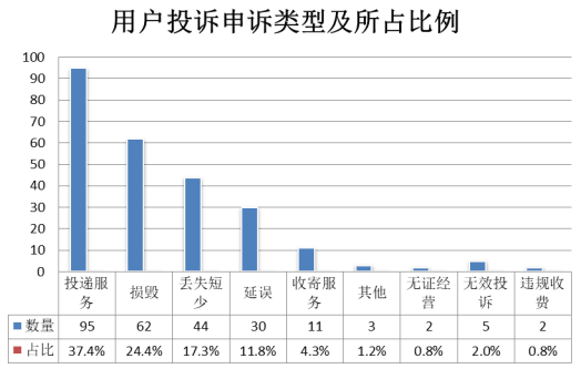 本月投诉、申诉较为集中的问题分别为投递服务(95件、37.4%)、损毁(62件、24.4%)、丢失短少(44件、17.3%)。